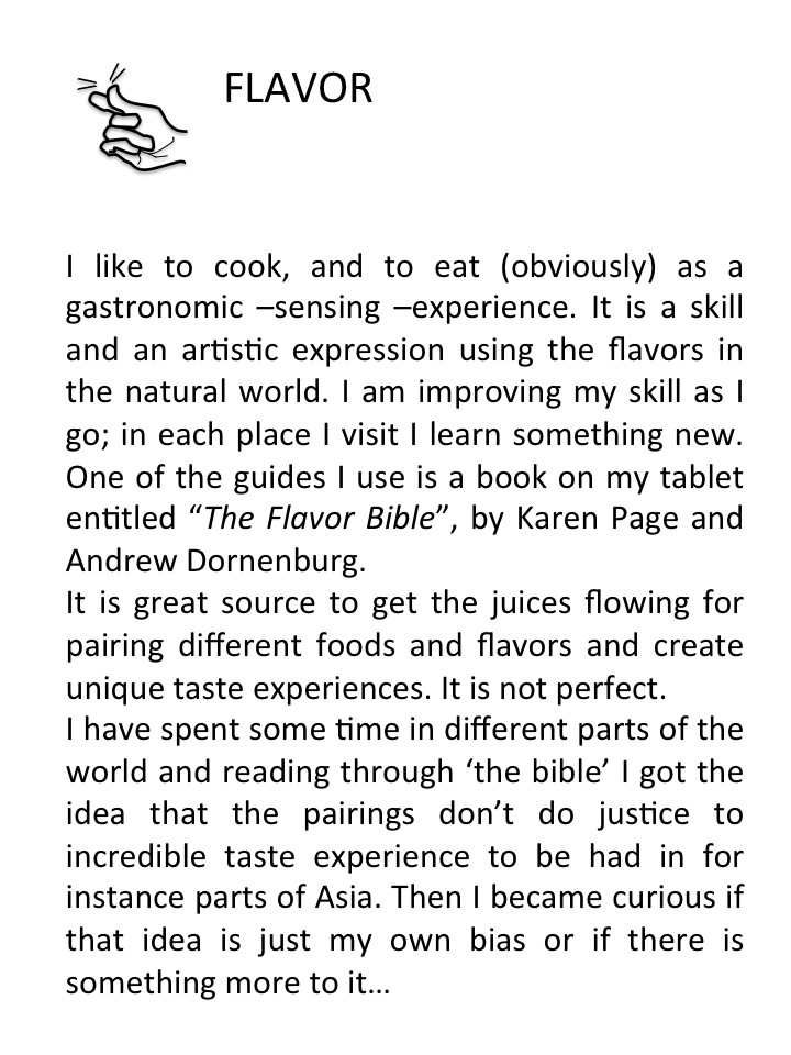 Sources like the “The Flavor Bible” are based on the food-pairing hypothesis, rooted in the idea of pairing food based on shared compounds as is common in Western traditions. Based on their data-driven approach, the authors found that in East Asian cuisines compound sharing ingredients is avoided, and that Southern European cuisine is closer to Latin American cuisines in signature ingredients than it is to Western European cuisine. If you don’t feel up to going through all the statistics in the article, please just take a look at it for the great visualizations of the differences in FOOD ART. It is enticing and invites you to experience and expand your world through your eyes and taste buds. Oh, and also through your NOSE. Exercise your senses!